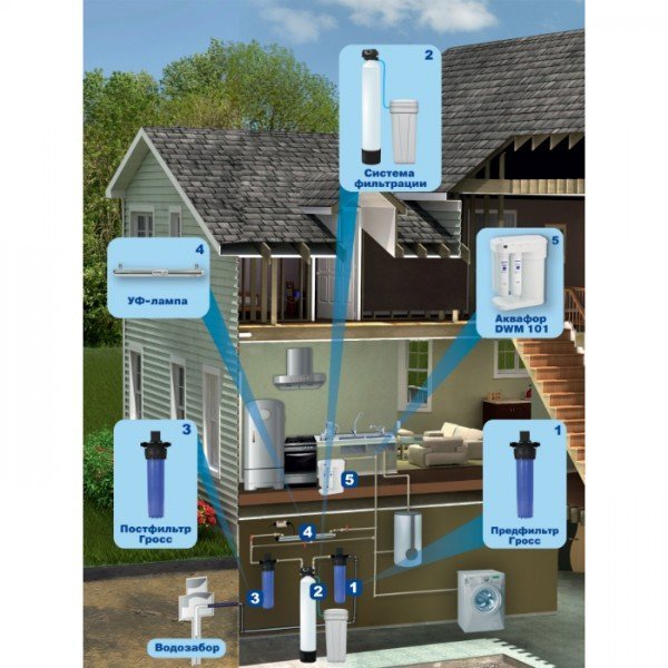 | Вода желто-коричневого цвета, образует осадок при отстаивании. При кипячении выпадает осадок солей жесткости. | Очистка от растворенного железа до 8 мг/л, марганца и солей жесткости при незначительном содержании органических веществ. |