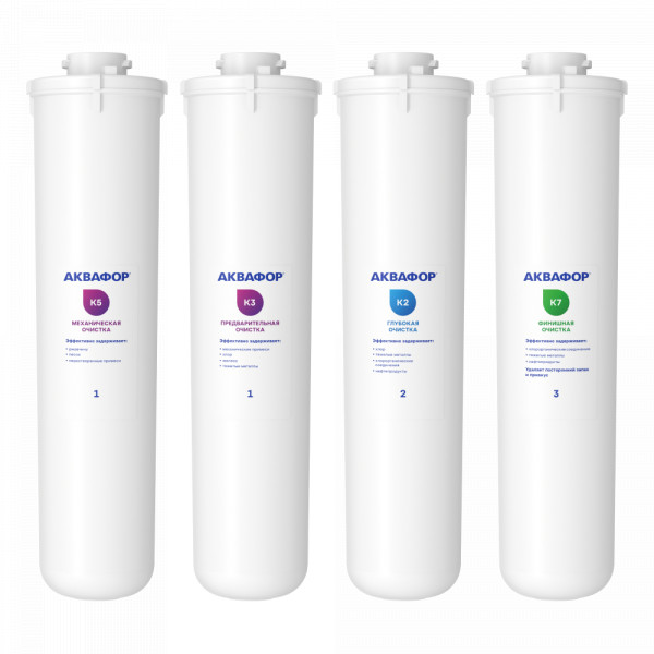 • Комплект сменных модулей глубокой очистки. Оптимален для мягкой воды. В условиях жесткой воды он полностью выполняет функцию глубокой очистки от вредных примесей, однако не снижает минерализацию. Поэтому, если при кипячении на нагревательных элементах образуется белый налет, рекомендуем рассмотреть специализированный комплект с умягчающим модулем для глубокой очистки воды.