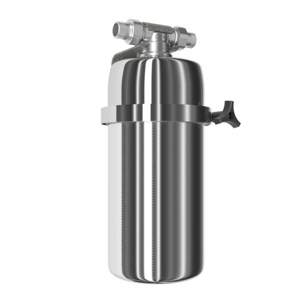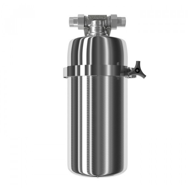 Магистральный фильтр среднего размера для глубокой фильтрации горячей воды. Модель оснащена быстросъемным креплением «американка». Нижний полукорпус изготовлен из нержавеющей стали марки AISI 316, особенно устойчивой к коррозии и высоким температурам.
